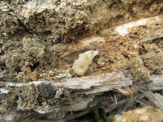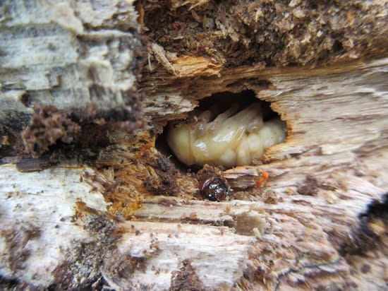 この材のやわらかそうなところに手グワを入れてみると、小さなヒラタ♂のサナギが出ました。